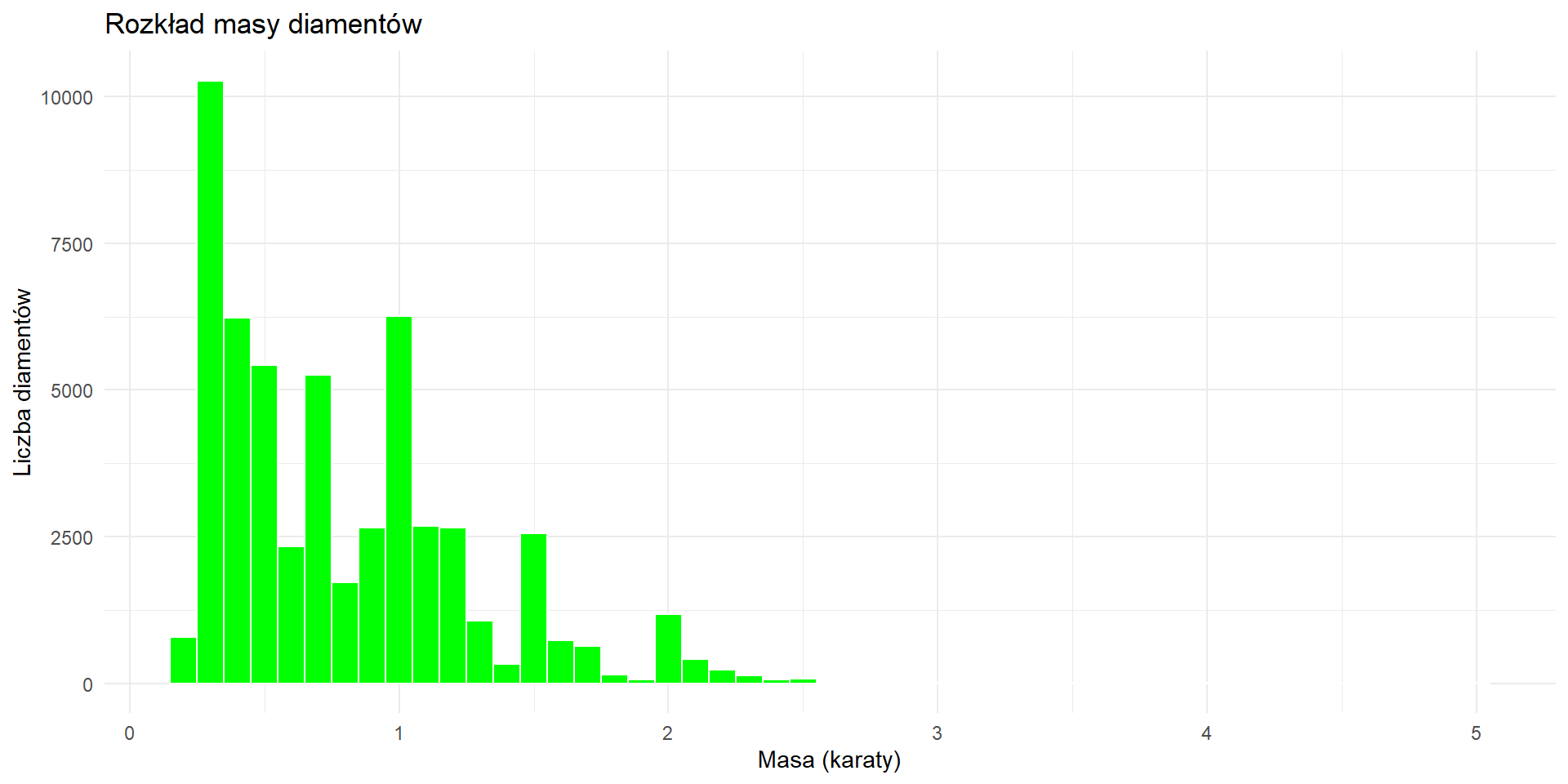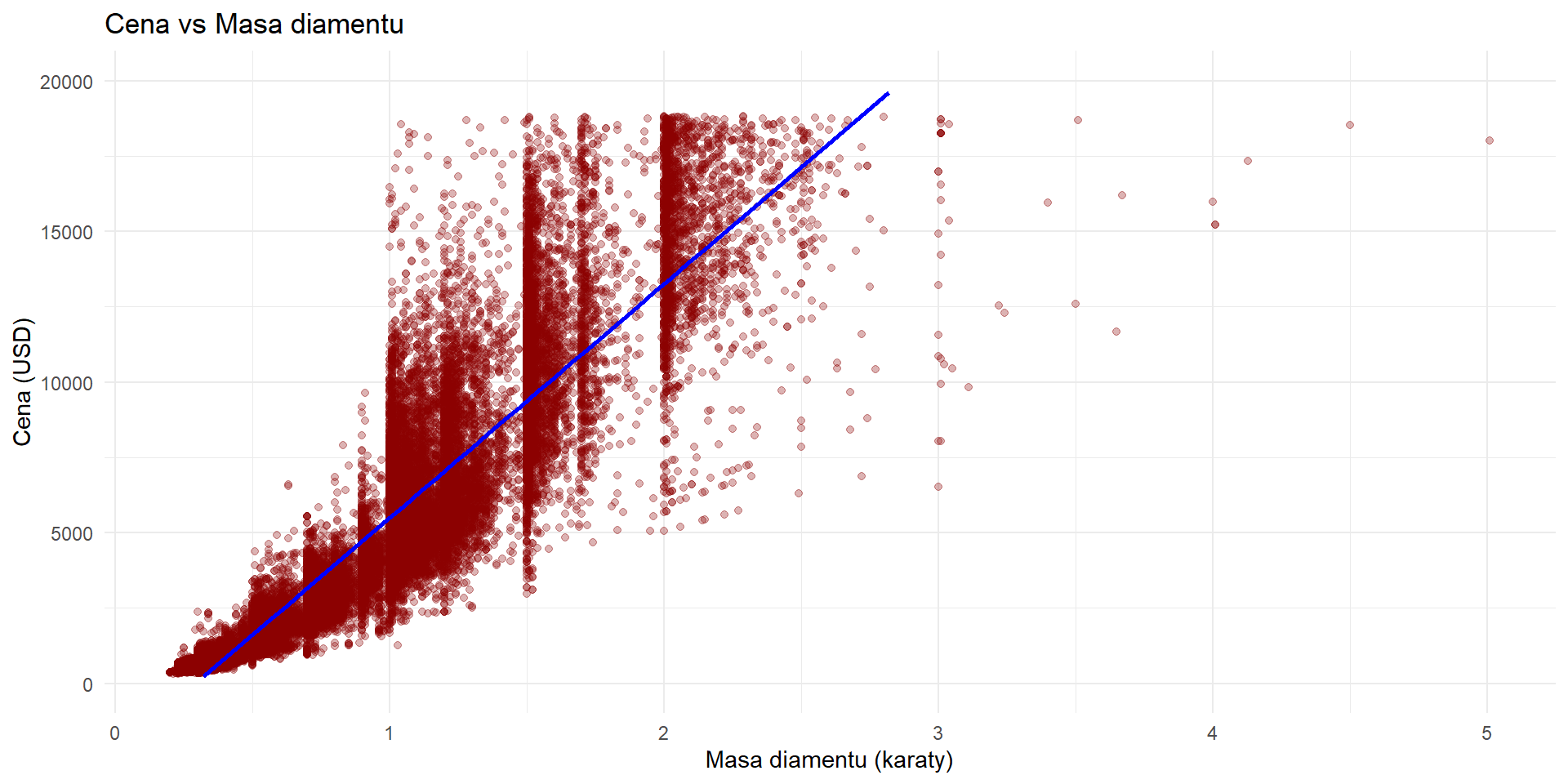 Wykres wyraźnie pokazuje, że im większa masa diamentu, tym wyższa jego cena. Wynika to z rzadkości dużych kamieni, które są trudniejsze do wydobycia i bardziej pożądane na rynku.
