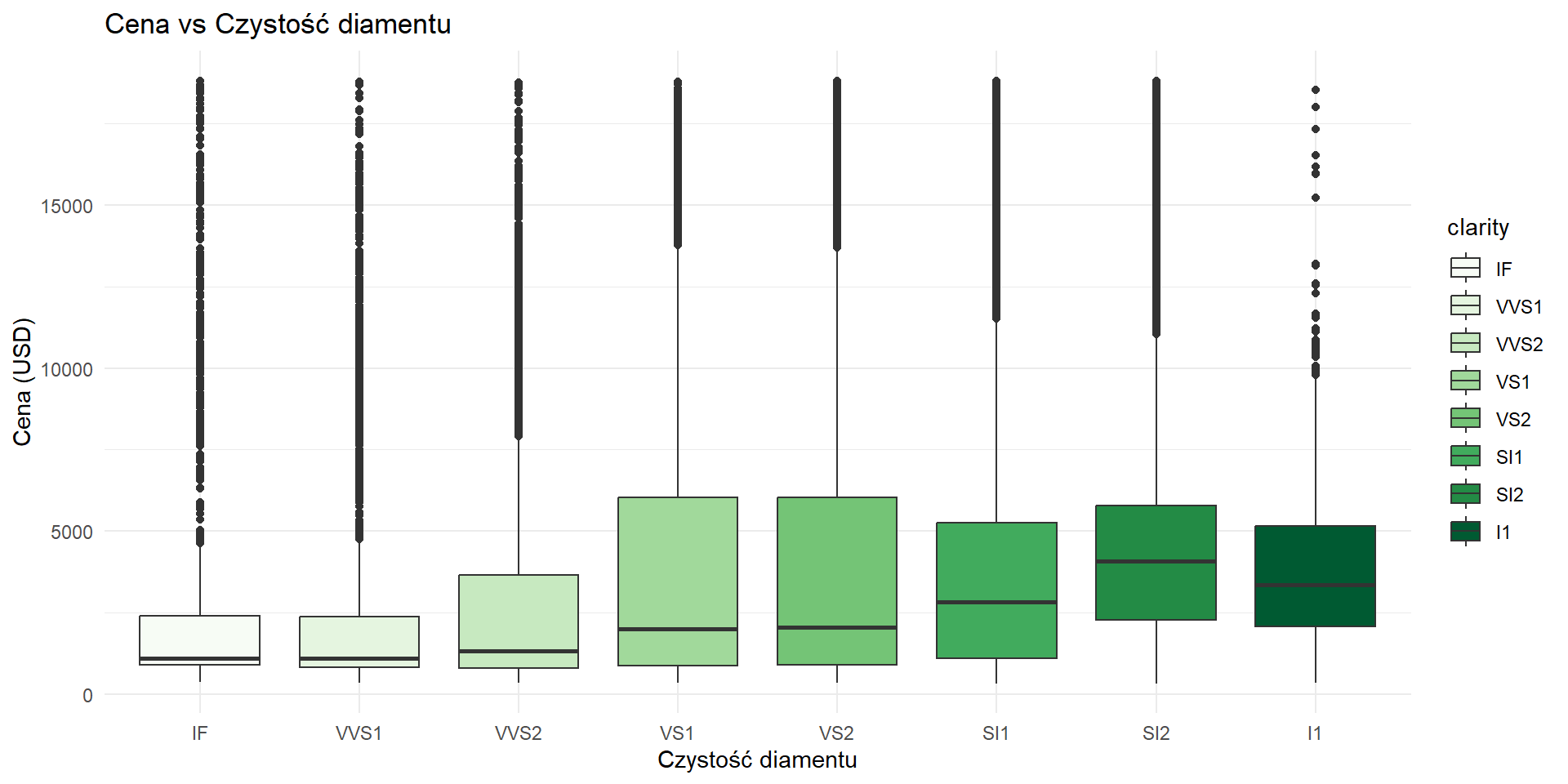 Z wykresu wynika, że diamenty o gorszych kolorach mają wyższe mediany cen w porównaniu do diamentów o lepszych kolorach . Jednak różnice między cenami w poszczególnych kategoriach kolorów są niewielkie i mniej wyraźne niż w przypadku innych czynników.
