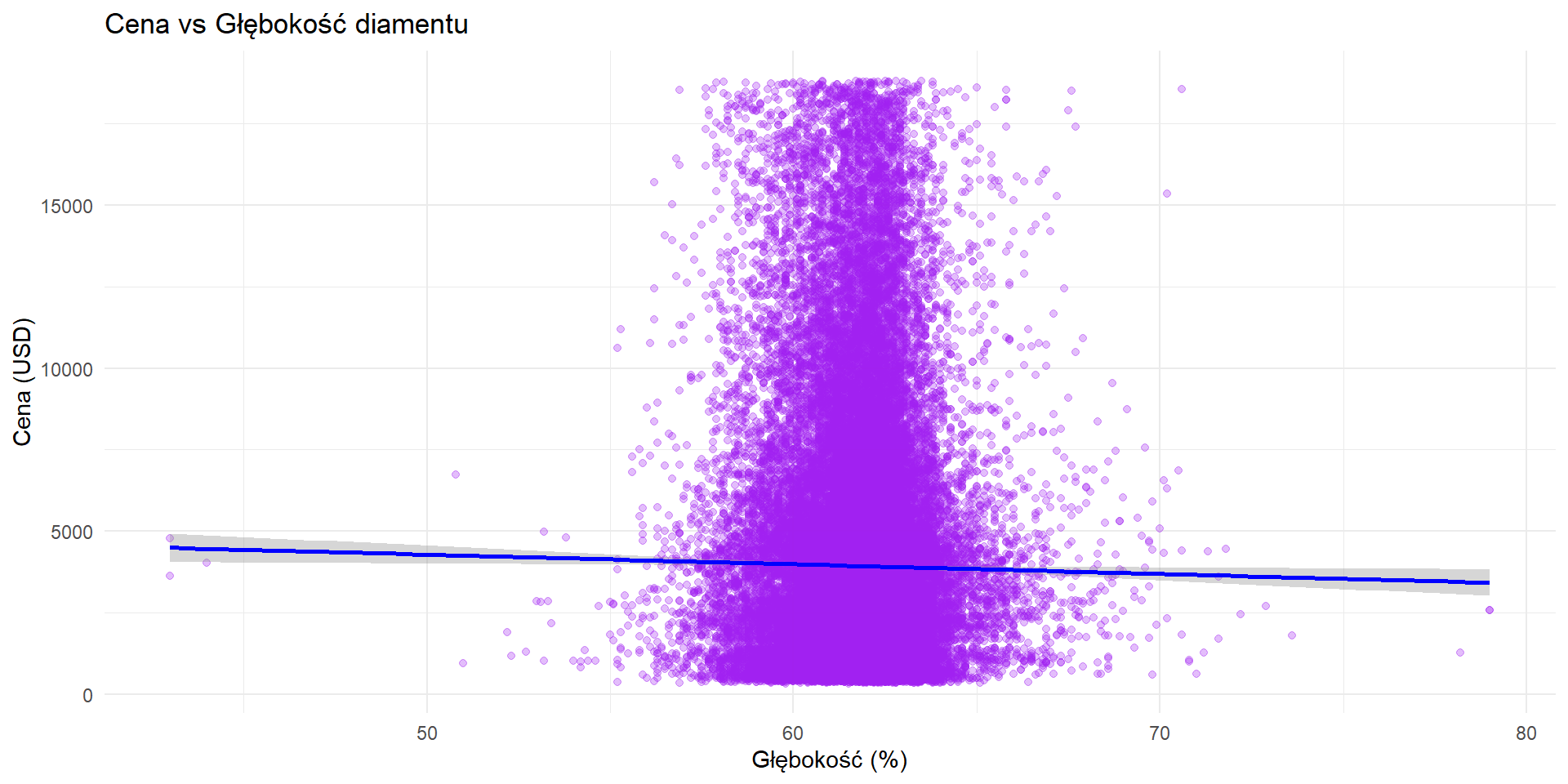 Z wykresu wynika, że zależność między głębokością diamentu a jego ceną jest słaba. Większość diamentów ma głębokość około 60%, a ceny w tym zakresie są bardzo zróżnicowane.