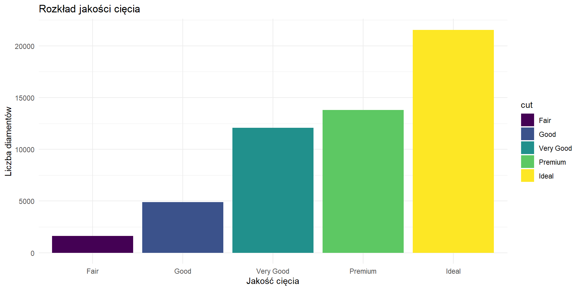 Najczęściej występujące cięcie to Ideal, a takich diamentów jest aż 21 551.Za to najrzadziej występujące cięcie to Fair którego jest tylko 1610.