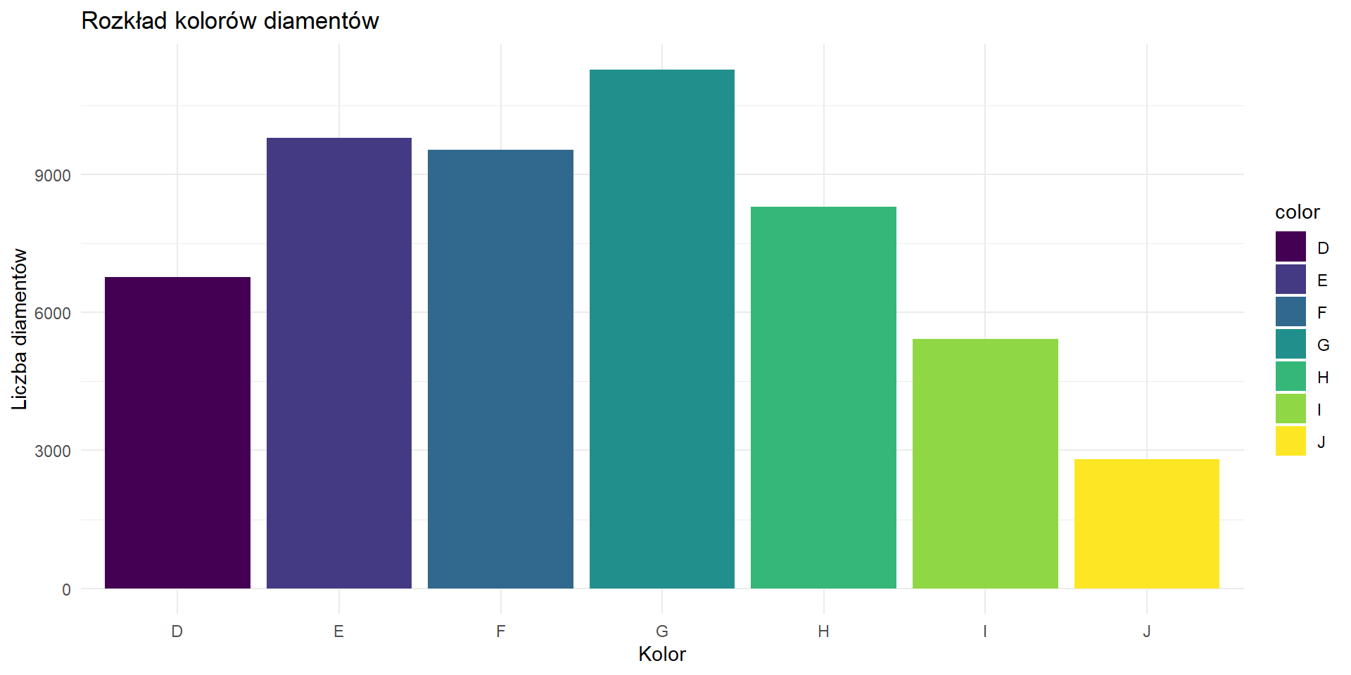 Najwięcej diamentów jesy w kolorze G i jest ich 11292, a najrzadziej występują diamenty o najgorszym kolorze czyli J, których jest tylko 2808.